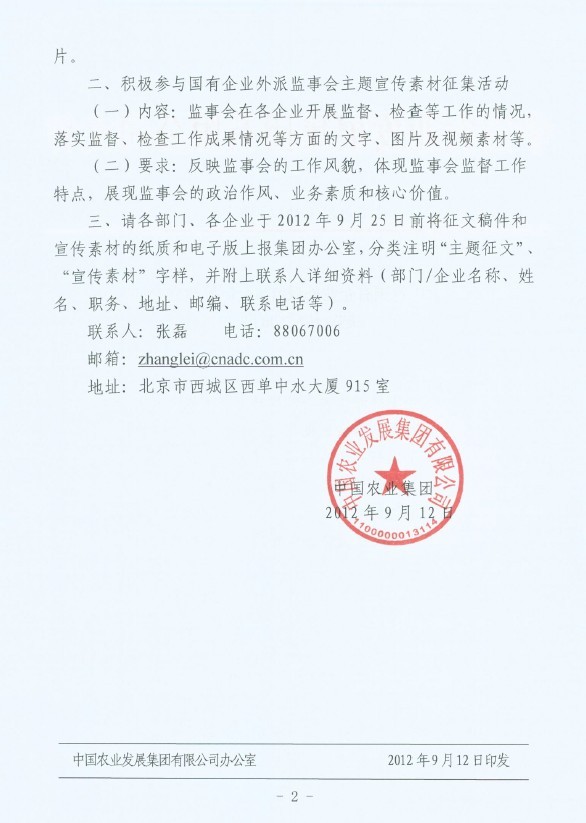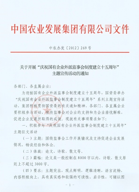 近期收到集团《关于开展;庆祝国有企业外派监事会制度建立十五周年;主题宣传活动的通知》(如下),请各位有兴趣的同事详细阅读文件,并将;主题征文;及;宣传素材;稿件于9月24日前发至总经办邮箱。