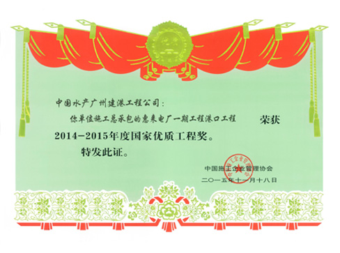 12月18日,2014-2015年度创建国家优质工程总结表彰大会在北京召开,广建公司施工总承包的广东惠来电厂一期工程港口工程,荣获国家优质工程奖。
