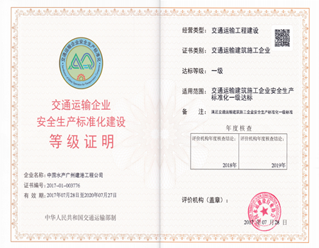 评价专家组专家对公司总部和阳江港13#、14#通用泊位工程、东莞市虎门港沙田港区西大坦作业区驳船码头工程和深圳湾滨海休闲带西段D段工程等3个项目部施工现场对安全生产标准化施工情况进行检查和评价。通过为期5天的评价检查,评价专家组对广建公司安全生产标准化开展情况给予充分肯定。认为公司安全生产责任体系健全,安全生产监督到位,基础资料齐全,施工现场规范,安全生产标准化建设满足《交通运输企业安全生产标准化建设评价管理办法》(交安监发[2016]133号)及;一级交通运输建筑施工企业安全生产标准化评价实施细则;要求。7月28日,经交通运输部规划研究院公示通过,中国水运建设行业协会向广建公司颁发;交通运输建筑施工企业安全生产标准化建设一级等级证明;。